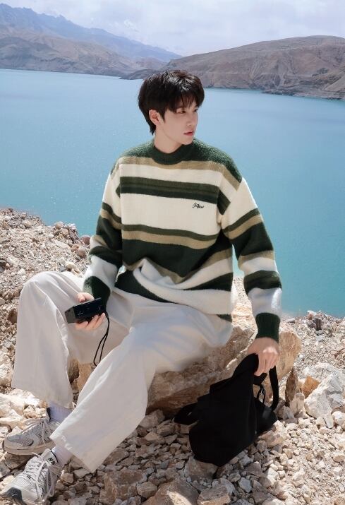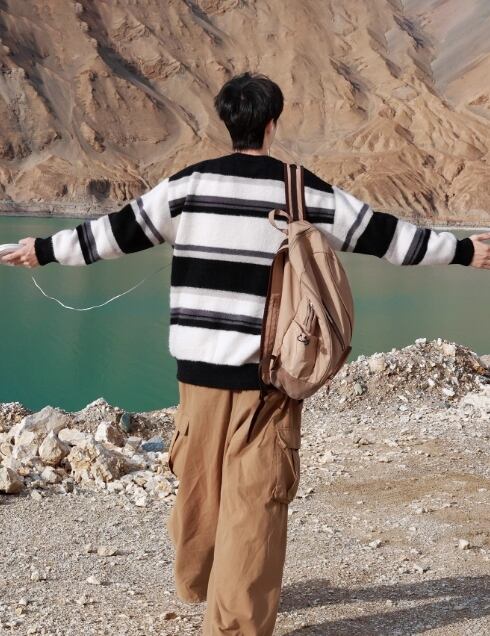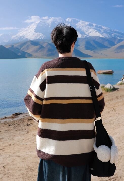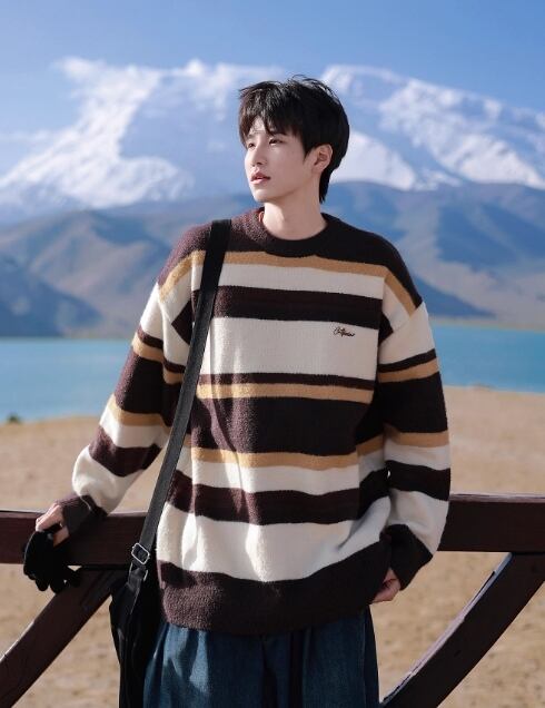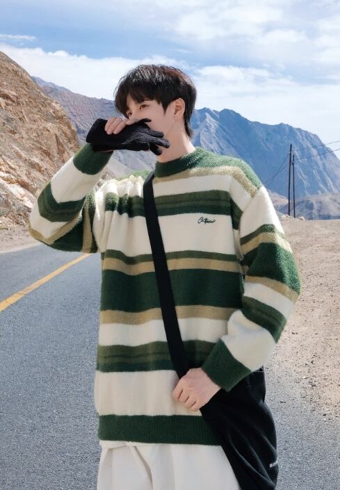 配色ストライプ クルーネック セーター メンズ 冬用 ゆったり ゆるめデザイン メンズ ニットジャケット