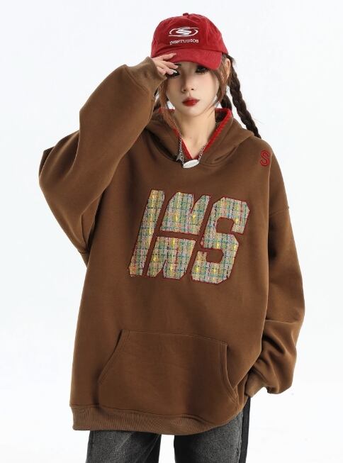 ドロップショルダー カップル向け アメリカンスタイル ニットワッペン刺繍ロゴ入りスウェット ゆったり 裏起毛 フード付きパーカー