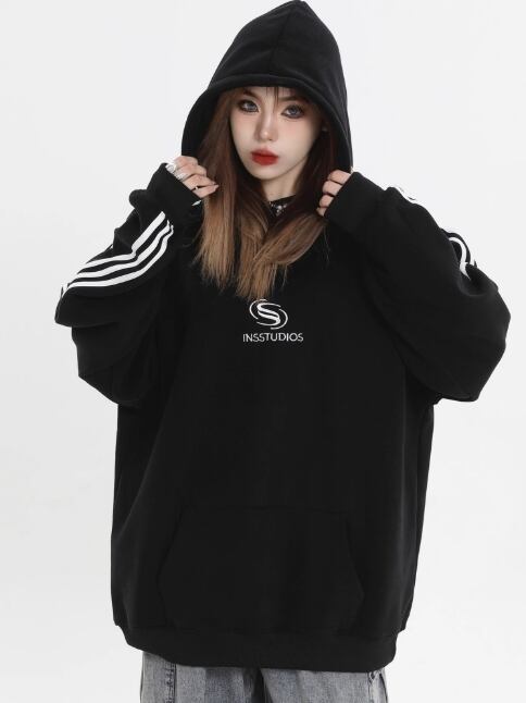 カップルでもOK 小さなロゴとスリーストライプデザインのスウェット 厚手 裏起毛 フード付きパーカー